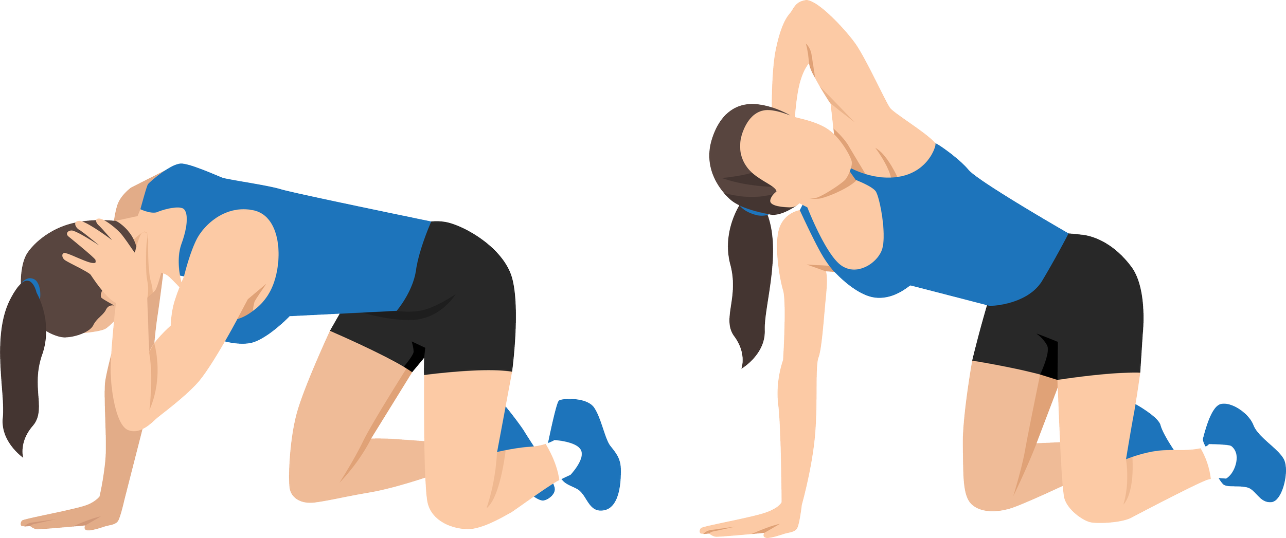 Thoracic stretching improves mobility in the upper and mid-back, helping reduce stiffness, poor posture, and shoulder or neck discomfort. Benefits include improved spinal alignment, better breathing, and flexibility. To perform the quadruped thoracic stretch, start on hands and knees. Place one hand behind your head. Rotate your elbow towards the opposite hand, then sweep it up towards the ceiling, following with your gaze. Hold for 15–30 seconds, repeating 2–3 times.